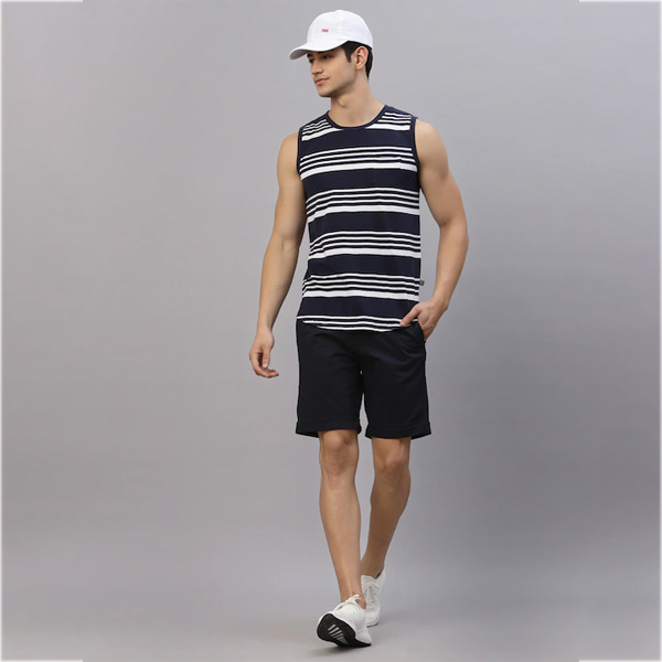 Men Navy Blue & White Striped Round Neck Sleeveless T-Shirt Vest