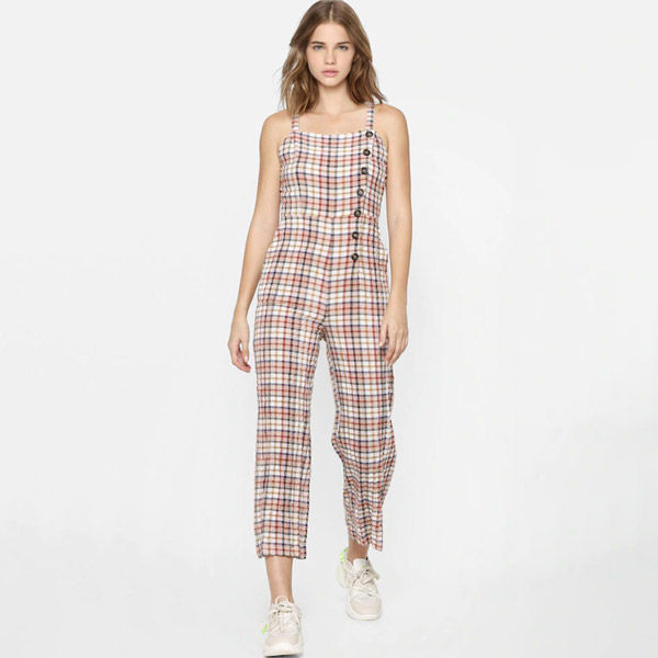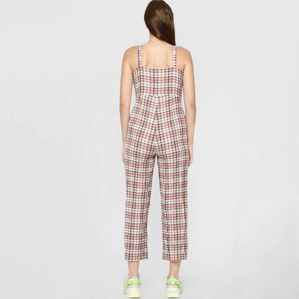 • Beige & White Checked Basic Jumpsuit, has a square neck, sleeveless, 2 pockets